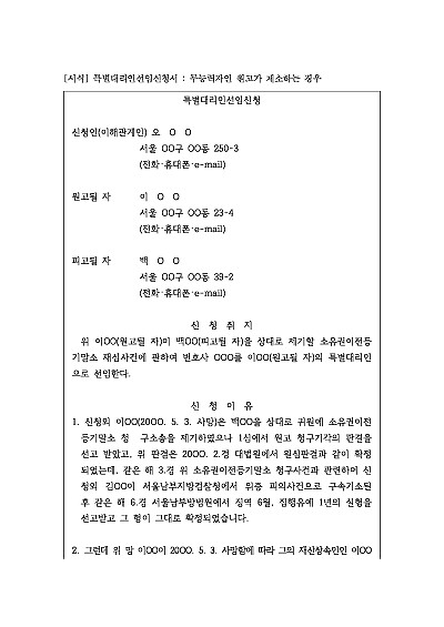 주요내용 : 법정대리인이 없거나 대리권이 없는 경우 또는 법정대리인과 본인 사이의 이해가 상반되는 행위가 필요가 경우에 미성년자 등의 법률적 권익을 보호하기 위한 목적으로 사용되어지는 신청서 양식임. 단 무단전재 방지목적으로 PDF 파일로 올리니, 구매하신 후 혹 원본 파일이 필요하신 분들은 톡이나 문자, 메일, 전화 등을 주시면 작성방법 등에 대한 간단한 무료상담과 함께 원본 파일을 보내드리도록 하겠습니다.