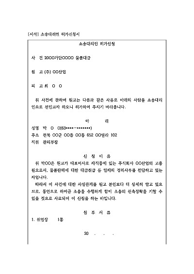주요내용 : 당사자 본인이 고령이거나 건강상의 이유 또는 기타 사정으로 인해 직접 소송을 수행하기 어려운 경우 밀접한 관계에 있는 친족 등이 대신 소송을 진행할 목적으로 사용되어지는 신청서 양식임. 단 무단전재 방지목적으로 PDF 파일로 올리니, 구매하신 후 혹 원본 파일이 필요하신 분들은 톡이나 문자, 메일, 전화 등을 주시면 작성방법 등에 대한 간단한 무료상담과 함께 원본 파일을 보내드리도록 하겠습니다.