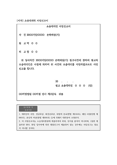 주요내용 : 소송대리인이 더 이상 당사자를 대리하여 소송을 수행하지 않겠다는 의사를 법원에 공식적으로 알리고, 그로 인해 자신의 법적 책임을 종결하기 위한 목적으로 사용되어지는 신청서 양식. 단 무단전재 방지목적으로 PDF 파일로 올리니, 구매하신 후 혹 원본 파일이 필요하신 분들은 톡이나 문자, 메일, 전화 등을 주시면 작성방법 등에 대한 간단한 무료상담과 함께 원본 파일을 보내드리도록 하겠습니다.