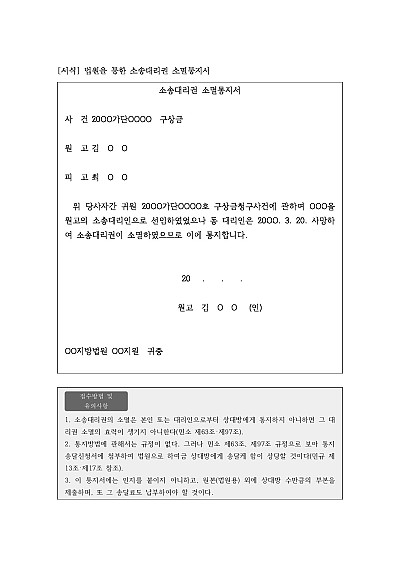 주요내용 : 대리권 소멸 후 그 통지가 있을 때까지는 대리권이 소멸하지 않은 것으로 간주되기 때문에 그 사실을 상대방에 고지하여 소송절차의 안정성과 명확성을 확보하기 위한 목적으로 사용되어지는 신청서 양식임. 단 무단전재 방지목적으로 PDF 파일로 올리니, 구매하신 후 혹 원본 파일이 필요하신 분들은 톡이나 문자, 메일, 전화 등을 주시면 작성방법 등에 대한 간단한 무료상담과 함께 원본 파일을 보내드리도록 하겠습니다.