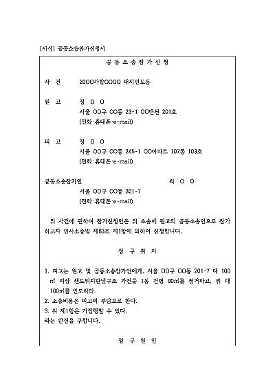 주요내용 : 소송의 결과가 당사자일방과 제3자에게 합일적으로 확정되어야 할 경우 제3자가 소송의 당사자가 되어 자신의 권리나 이익을 보호하기 위한 목적으로 사용되어지는 신청서 양식임. 단 무단전재 방지목적으로 PDF 파일로 올리니, 구매하신 후 혹 원본 파일이 필요하신 분들은 톡이나 문자, 메일, 전화 등을 주시면 작성방법 등에 대한 간단한 무료상담과 함께 원본 파일을 보내드리도록 하겠습니다.