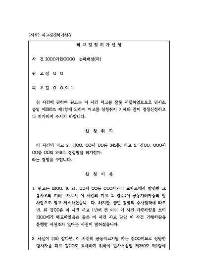 주요내용 : 원고가 소제기시 피고를 잘못 지정한 경우, 올바른 피고로 교체하여 소송을 유효하게 진행할 목적으로 사용되어지는 신청서 양식임. 단 무단전재 방지목적으로 PDF 파일로 올리니, 구매하신 후 혹 원본 파일이 필요하신 분들은 톡이나 문자, 메일, 전화 등을 주시면 작성방법 등에 대한 간단한 무료상담과 함께 원본 파일을 보내드리도록 하겠습니다.