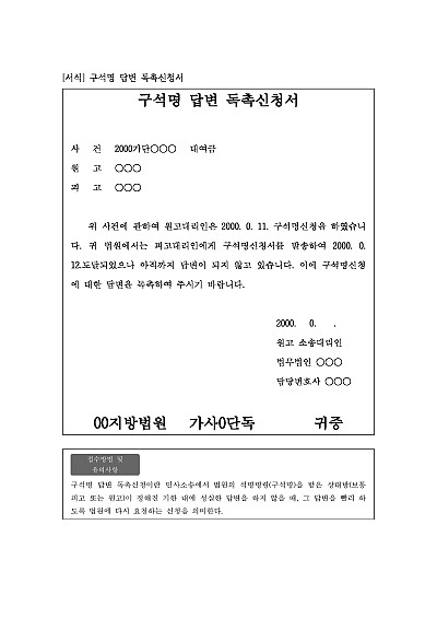 주요내용 : 민사소송에서 법원의 석명명령(구석명)을 받은 상대방(보통 피고 또는 원고)이 정해진 기한 내에 성실한 답변을 하지 않을 때, 그 답변을 빨리 하도록 법원에 다시 요청할 때 사용되어지는 신청서 양식임. 단 무단전재 방지목적으로 PDF 파일로 올리니, 구매하신 후 혹 원본 파일이 필요하신 분들은 톡이나 문자, 메일, 전화 등을 주시면 작성방법 등에 대한 간단한 무료상담과 함께 원본 파일을 보내드리도록 하겠습니다.