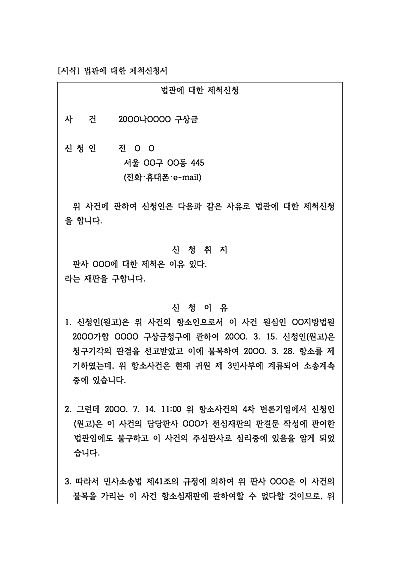 주요내용 : 공정한 재판을 받을 권리를 보장하기 위해 특정 사건에서 법관이 공정성을 잃을 우려가 있는 경우 해당 법관을 재판에서 배제시키기 위한 목적으로 사용되어지는 신청서 양식임. 단 무단전재 방지목적으로 PDF 파일로 올리니,구매하신 후 혹 원본 파일이 필요하신 분들은 톡이나 문자, 메일, 전화 등을 주시면 작성방법 등에 대한 간단한 무료상담과 함께 원본 파일을 보내드리도록 하겠습니다.