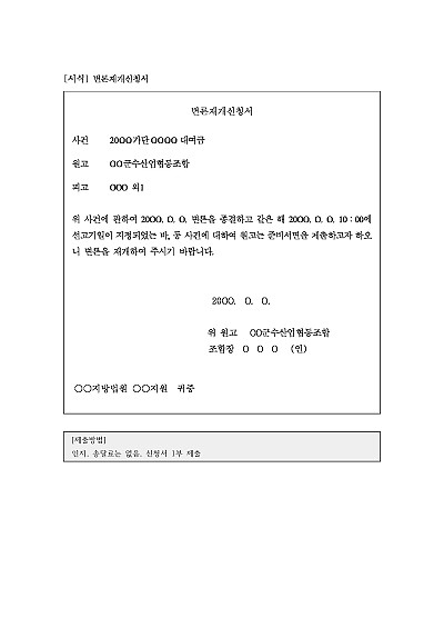 주요내용 : 변론이 이미 종결된 상태에서, 판결 선고 전에 다시 변론을 열어 추가적인 주장이나 증거를 제출하고 심리를 진해할 필요가 있을 때 그 절차 진행을 위해 사용되어지는 신청서 양식임. 단 무단전재 방지목적으로 PDF 파일로 올리니구매하신 후 혹 원본 파일이 필요하신 분들은 톡이나 문자메일전화 등을 주시면 작성방법 등에 대한 간단한 무료상담과 함께 원본 파일을 보내드리도록 하겠습니다.
