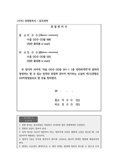 주요내용 : 전속관할은 적용되지 아니하며, 임의관할에서만 인정되고, 이는 당사자들의 편의를 증진하고 송송 경제를 달성하기 위한 목적으로 사용되어지는 양식임. 단 무단전재 방지목적으로 PDF 파일로 올리니, 구매하신 후 혹 원본 파일이 필요하신 분들은 톡이나 문자, 메일, 전화 등을 주시면 작성방법 등에 대한 간단한 무료상담과 함께 원본 파일을 보내드리도록 하겠습니다.