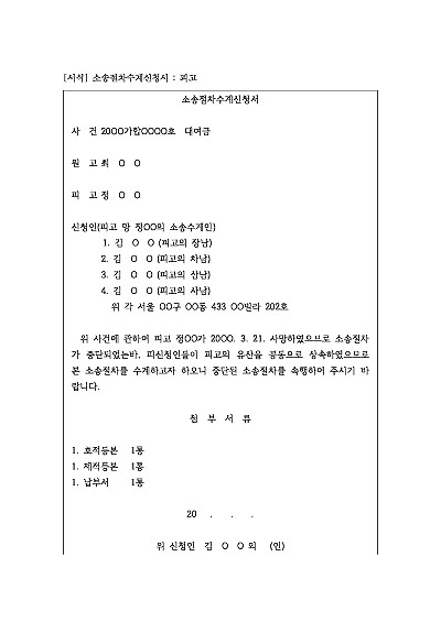 주요내용 : 당사자의 사망, 법인의 소멸, 법정대리인의 사망 등의 사유로 소송절차가 중단되었을 대 상속이나 파산관재인과 같이 법률에 따라 소송을 이어받을 수 있는 사람이 법원에 신청하여 중단된 소송을 계속진행할 목적으로 사용되어지는 신청서 양식임. 단 무단전재 방지목적으로 PDF 파일로 올리니구매하신 후 혹 원본 파일이 필요하신 분들은 톡이나 문자메일전화 등을 주시면 작성방법 등에 대한 간단한 무료상담과 함께 원본 파일을 보내드리도록 하겠습니다.