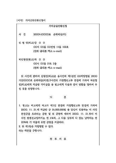 주요내용 1심에서 가집행선고를 받고 판결금을 지급한 후, 항소심에서 1심 판결이 취소되거나 변경될 경우 지급한 판결금을 반환받기 위한 목적으로 사용되어지는 신청서 양식임단 무단전재 방지목적으로 PDF 파일로 올리니구매하신 후 혹 원본 파일이 필요하신 분들은 톡이나 문자메일전화 등을 주시면 작성방법 등에 대한 간단한 무료상담과 함께 원본 파일을 보내드리도록 하겠습니다.