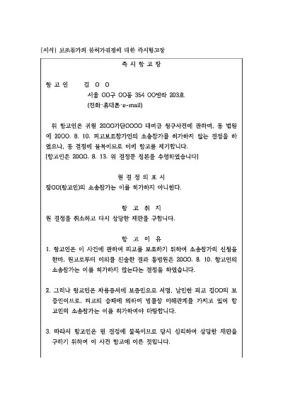 주요내용 : 불허가 결정을 취소하고 보조참가인의 자격으로 소송에 참여하는 것을 목적으로 사용되어지는 항고장 양식임. 단 무단전재 방지목적으로 PDF 파일로 올리니, 구매하신 후 혹 원본 파일이 필요하신 분들은 톡이나 문자, 메일, 전화 등을 주시면 작성방법 등에 대한 간단한 무료상담과 함께 원본 파일을 보내드리도록 하겠습니다.
