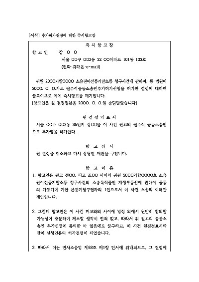 주요내용 : 추가될 원고의 동의가 없었음에도 법원이 허가결정을 하였을 경우 그 결정의 위법성을 시정하기 위한 목적으로 사용되어지는 항고장 양식임 . 단 무단전재 방지목적으로 PDF 파일로 올리니, 구매하신 후 혹 원본 파일이 필요하신 분들은 톡이나 문자, 메일, 전화 등을 주시면 작성방법 등에 대한 간단한 무료상담과 함께 원본 파일을 보내드리도록 하겠습니다.