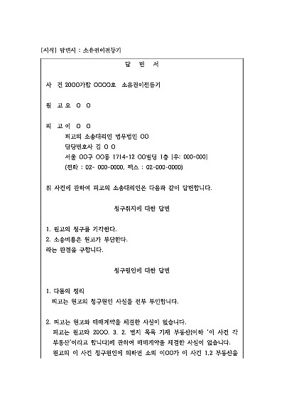 주요내용 : 소유권이전등기사건의 요건사실인 매매계약의 체결사실 및 계약 내용에 따른 대금지급 등의 항변을 통해 원고의 청구를 기각하고자 하는 목적으로 사용되어지는 답변서 양식임. 단 무단전재 방지목적으로 PDF 파일로 올리니, 구매하신 후 혹 원본 파일이 필요하신 분들은 톡이나 문자, 메일, 전화 등을 주시면 작성방법 등에 대한 간단한 무료상담과 함께 원본 파일을 보내드리도록 하겠습니다.