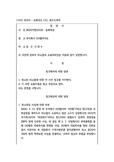 주요내용 : 양수도계약 사건의 요건사실인 양수도계약체결 사실 , 계약에 따른 의무 이행 사실 등에 대한 항변을 통해 원고의 청구를 기각하고자 하는 목적으로 사용되어지는 답변서 양식임. 단 무단전재 방지목적으로 PDF 파일로 올리니, 구매하신 후 혹 원본 파일이 필요하신 분들은 톡이나 문자, 메일, 전화 등을 주시면 작성방법 등에 대한 간단한 무료상담과 함께 원본 파일을 보내드리도록 하겠습니다.