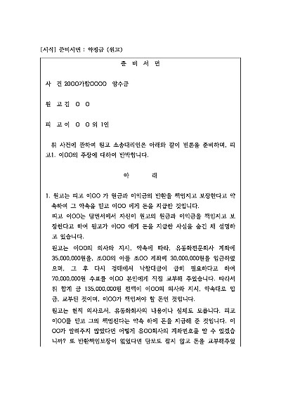 준비서면 : 약정금 (원고) 요약정보 및 구매