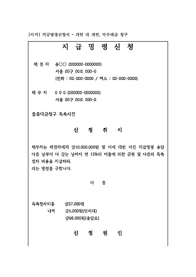 지급명령신청서 – 개인 대 개인, 미수대금 청구 요약정보 및 구매
