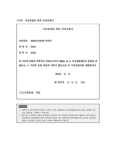 주요내용 : 지급명령에 불복한다는 의사를 법원에 전달하고, 지급명령의 효력을 상실시켜 정식 민사소송 절차를 진행하는 것을 목적으로 사용되어지는 신청서 양식임. 단 무단전재 방지목적으로 PDF 파일로 올리니, 구매하신 후 혹 원본 파일이 필요하신 분들은 톡이나 문자, 메일, 전화 등을 주시면 작성방법 등에 대한 간단한 무료상담과 함께 원본 파일을 보내드리도록 하겠습니다.