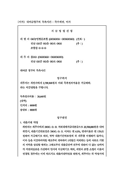 주요내용 : 대출거래약정, 원리금채무 변제 지체시 그 지급을 구하기 위한 목적으로 사용되어지는 신청서 양식임. 단 무단전재 방지목적으로 PDF 파일로 올리니구매하신 후 혹 원본 파일이 필요하신 분들은 톡이나 문자메일전화 등을 주시면 작성방법 등에 대한 간단한 무료상담과 함께 원본 파일을 보내드리도록 하겠습니다.