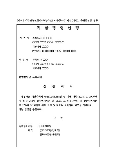 [로펌제작] 지급명령신청서(독촉사건) – 공동수급 사업(작업), 운영분담금 청구 요약정보 및 구매