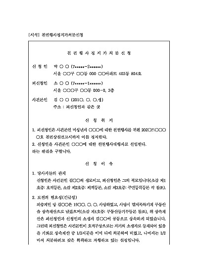 주요내용 : 친권의 남용 등으로 자녀의 복리를 심각하게 해치거나 해칠 우려가 있을 당해 친권자의 친권행사를 일시적으로 금지할 목적으로 사용되어지는 신청서 양식임. 단 무단전재 방지목적으로 PDF 파일로 올리니, 구매하신 후 혹 원본 파일이 필요하신 분들은 톡이나 문자, 메일, 전화 등을 주시면 작성방법 등에 대한 간단한 무료상담과 함께 원본 파일을 보내드리도록 하겠습니다.