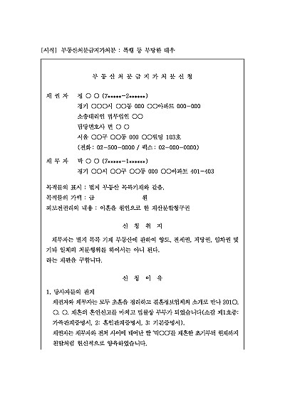 주요내용 이혼 재산분할 대상이 되는 부동산을 상대방이 제3자에게 매매, 증여 등 임의로 처분하는 것을 막아, 나중에 재산분할 판결대로 재산을 분할받지 못하게 되는 상황을 방지하기 위한 목적으로 사용되어지는 신청서 양식임단 무단전재 방지목적으로 PDF 파일로 올리니구매하신 후 혹 원본 파일이 필요하신 분들은 톡이나 문자메일전화 등을 주시면 작성방법 등에 대한 간단한 무료상담과 함께 원본 파일을 보내드리도록 하겠습니다.