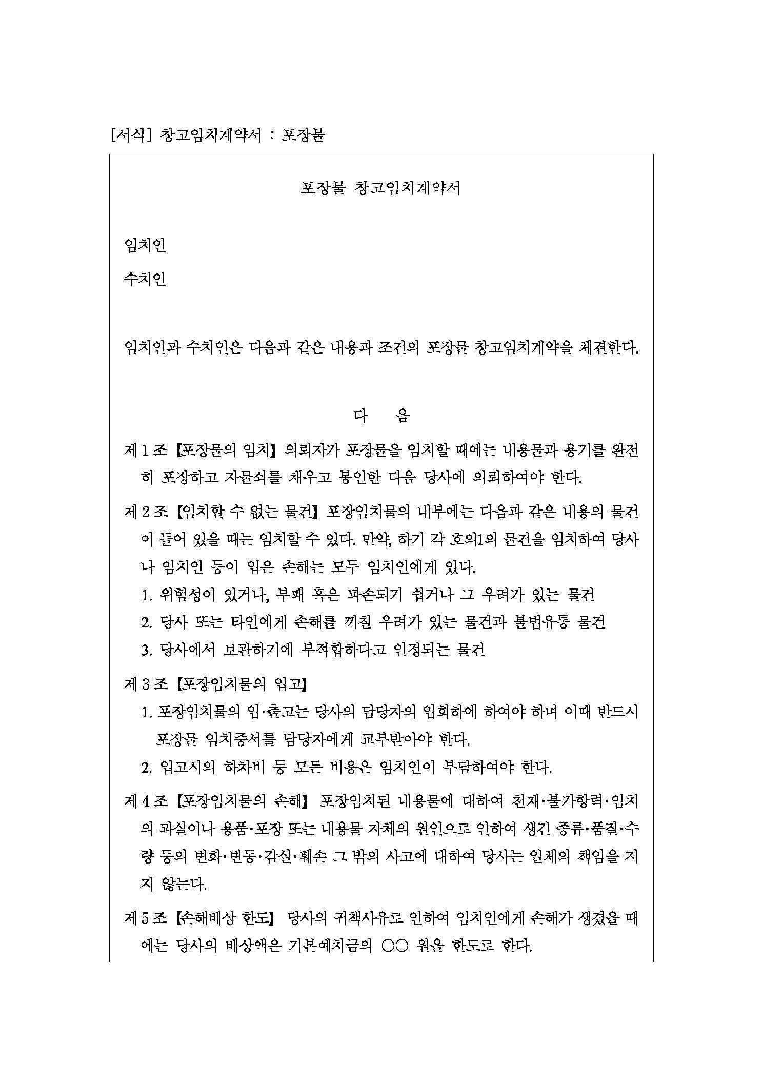 주요내용 : 포장물 임치, 임치할 수 없는 물건, 포장임치물의 입고, 포장임치물의 손해, 손해배상 한도, 통지사항, 포장임치물의 출고, 포장물 임치증서를 상실한 경우, 임치물 내용 점검, 임치물의 반환, 계약기간 및 해지 등 내용 기재. 단 무단전재 방지목적으로 PDF 파일로 올리니, 구매하신 후 혹 원본 파일이 필요하신 분들은 톡이나 문자, 메일, 전화 등을 주시면 작성방법 등에 대한 간단한 무료상담과 함께 원본 파일을 보내드리도록 하겠습니다.
