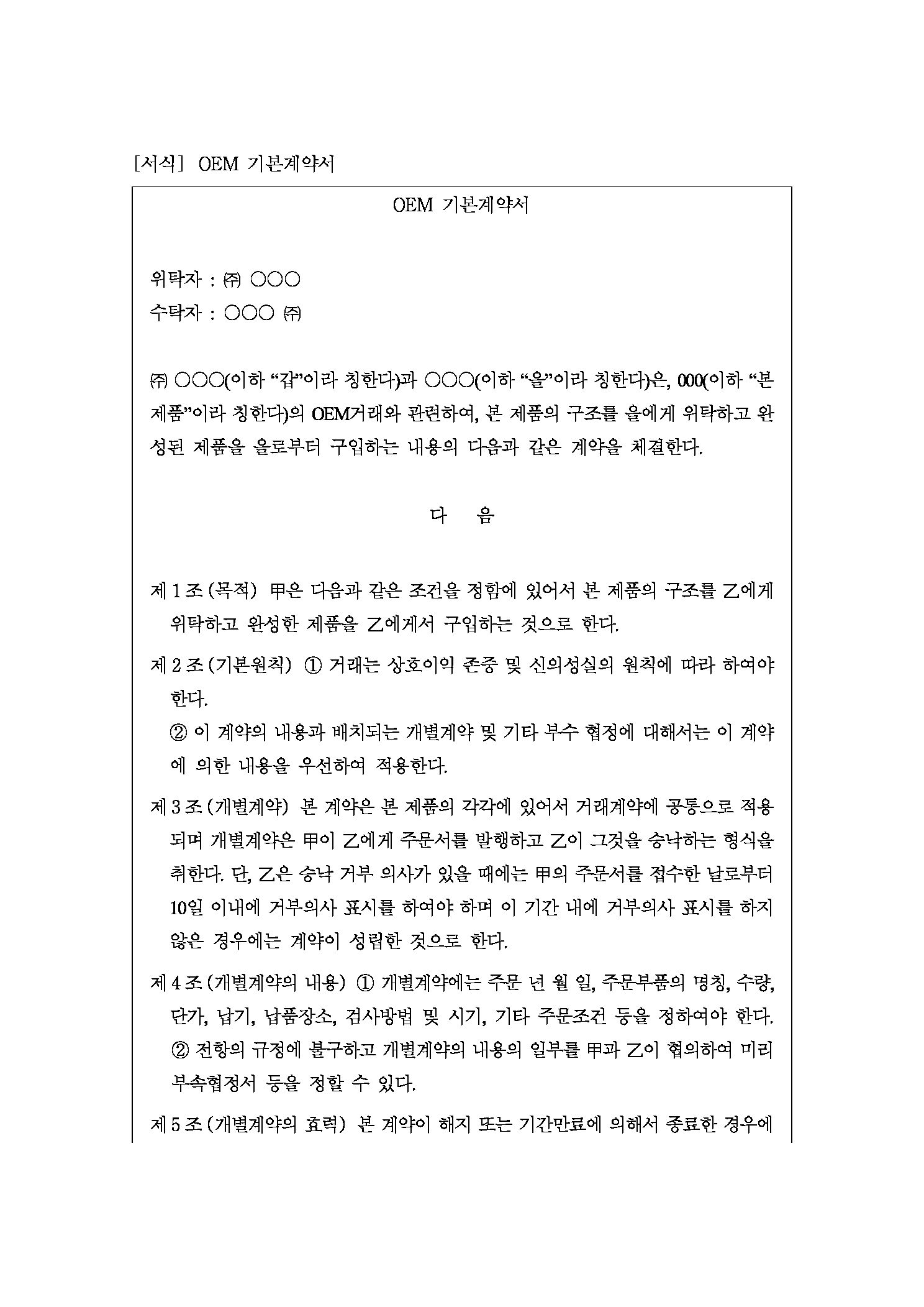 주요내용 : 개별계약 및 효력, 사용법, 상표 및 상표보증, 납품전 조사,납품, 납기, 수입검사, 소유권이전, 위험부담, 대금지급, AS, 제조물책딤, 공업소유권의 실시 및 출원, 비밀유지, 생산중단, 계약유효기간 및 계약해지, 기한의 이익상실 등 내용 기재. 단 무단전재 방지목적으로 PDF 파일로 올리니, 구매하신 후 혹 원본 파일이 필요하신 분들은 톡이나 문자, 메일, 전화 등을 주시면 작성방법 등에 대한 간단한 무료상담과 함께 원본 파일을 보내드리도록 하겠습니다.