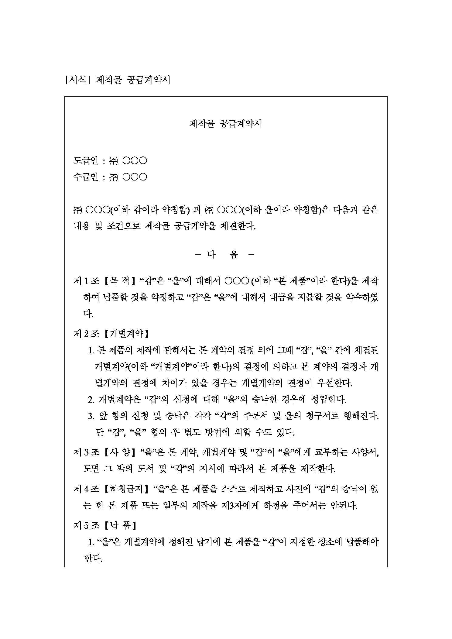주요내용 : 제작물 사양, 납품, 하청금지, 검사 및 검수, 소유권 및 위험부담, 보증, 대금지급방법, 계약해지 사유, 유효기간 등 내용 기재. 단 무단전재 방지목적으로 PDF 파일로 올리니, 구매하신 후 혹 원본 파일이 필요하신 분들은 톡이나 문자, 메일, 전화 등을 주시면 작성방법 등에 대한 간단한 무료상담과 함께 원본 파일을 보내드리도록 하겠습니다.