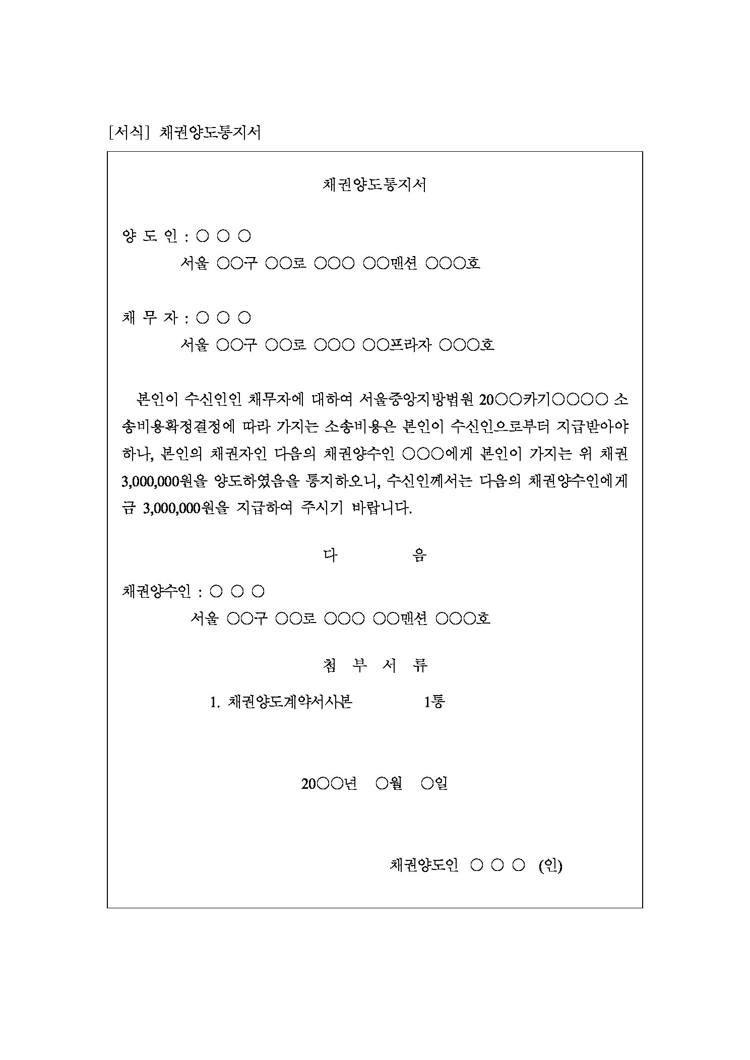 주요내용 : 채권양도양수계약 후 그 사실을 채무자에게 통지하기 위한 목적으로 사용하는 양식임. 단 무단전재 방지목적으로 PDF 파일로 올리니, 구매하신 후 혹 원본 파일이 필요하신 분들은 톡이나 문자, 메일, 전화 등을 주시면 작성방법 등에 대한 간단한 무료상담과 함께 원본 파일을 보내드리도록 하겠습니다.