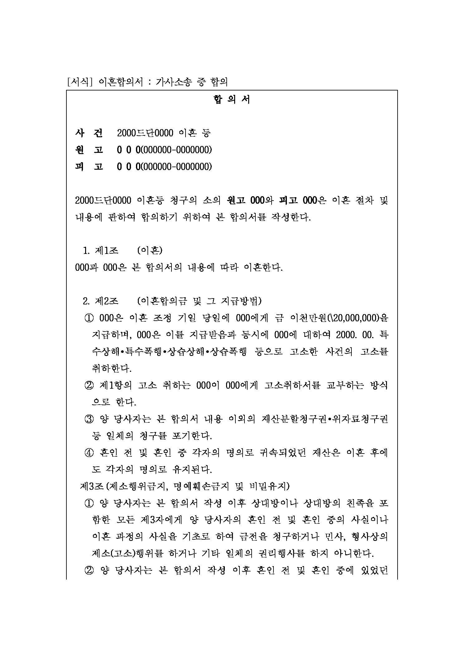 주요내용 : 이혼소송 중 이혼에 관한 합의 후 이혼합의금 지급 및 합의 후 제소행위금지, 명예훼손 및 비밀유지 등의 내용 기재. 단 무단전재 방지목적으로 PDF 파일로 올리니, 구매하신 후 혹 원본 파일이 필요하신 분들은 톡이나 문자, 메일, 전화 등을 주시면 작성방법 등에 대한 간단한 무료상담과 함께 원본 파일을 보내드리도록 하겠습니다.