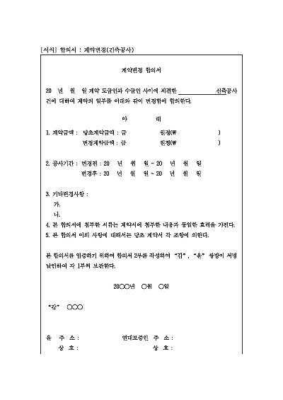 주요내용 : 도급계약체결 후 사정변경에 따른 공사대금 및 기간 등 변경시 사용되는 양식임. 단 무단전재 방지목적으로 PDF 파일로 올리니, 구매하신 후 혹 원본 파일이 필요하신 분들은 톡이나 문자, 메일, 전화 등을 주시면 작성방법 등에 대한 간단한 무료상담과 함께 원본 파일을 보내드리도록 하겠습니다.