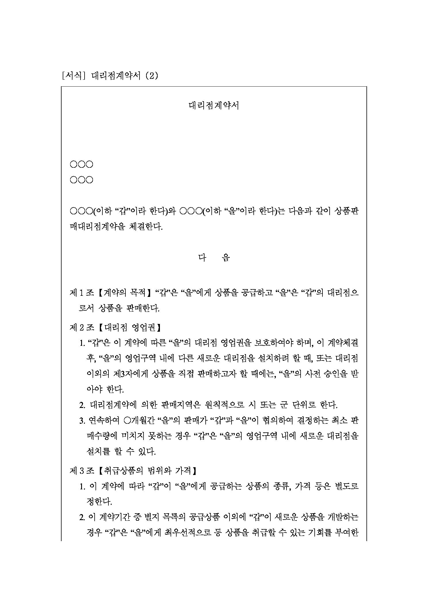 주요내용 : 계약 목적, 대리점 영업권, 취급상품의 범위 및 가격, 할인판매금지, 상품의 인도 및 반품, 대금지급, 계약위반시 조치, 유효기간 등 내용 기재. 단 무단전재 방지목적으로 PDF 파일로 올리니, 구매하신 후 혹 원본 파일이 필요하신 분들은 톡이나 문자, 메일, 전화 등을 주시면 작성방법 등에 대한 간단한 무료상담과 함께 원본 파일을 보내드리도록 하겠습니다.