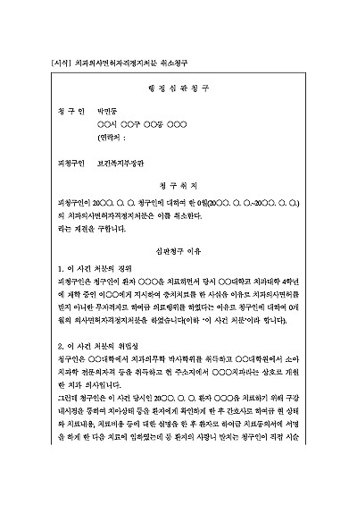 주요내용 : 치고의사면허자격정지처분을 받고 당해 처분의 위법 또는 부당성을 이유로 그 취소를 구하기 위한 목적으로 사용되어지는 신청서 양식임 . 단 무단전재 방지목적으로 PDF 파일로 올리니, 구매하신 후 혹 원본 파일이 필요하신 분들은 톡이나 문자, 메일, 전화 등을 주시면 작성방법 등에 대한 간단한 무료상담과 함께 원본 파일을 보내드리도록 하겠습니다.