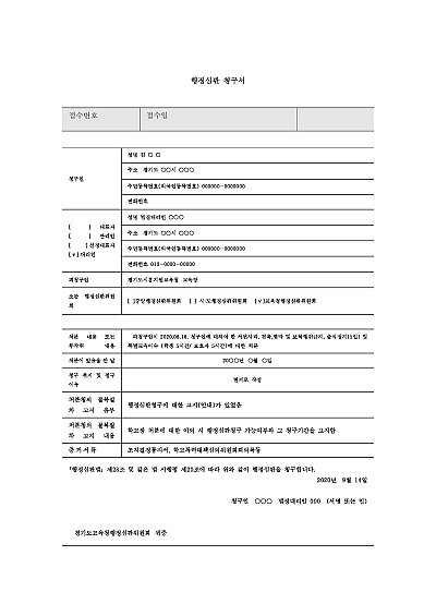 주요내용 : 학교폭력대책심의위원회의 조치(가해 학생 징계, 피해 학생 보호 조치 등)에 불복할 때, 교육청 행정심판위원회에 제기하는 권리구제 절차로, 서면으로 진행되며, 조치 취소나 감경을 목표로 사용되어지는 신청서 양식임. 단 무단전재 방지목적으로 PDF 파일로 올리니, 구매하신 후 혹 원본 파일이 필요하신 분들은 톡이나 문자, 메일, 전화 등을 주시면 작성방법 등에 대한 간단한 무료상담과 함께 원본 파일을 보내드리도록 하겠습니다.