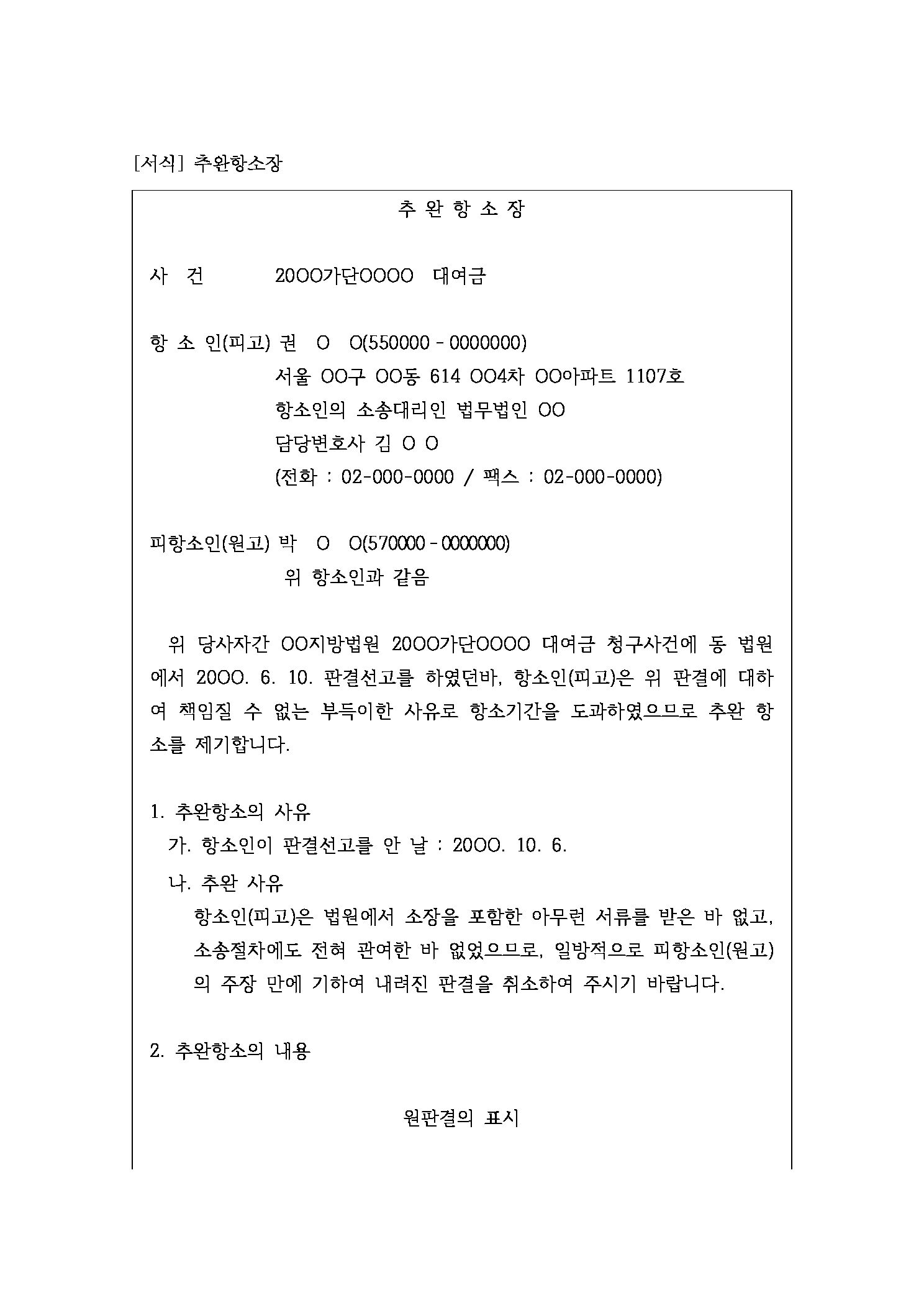 주요내용 : 자신도 모르는 사이에 판결이 확정된 경우(예: 공시송달), 사유가 없어진 날로부터 2주 안에 항소를 제기할 목적으로 사용되어지는 양식임. 단 무단전재 방지목적으로 PDF 파일로 올리니, 구매하신 후 혹 원본 파일이 필요하신 분들은 톡이나 문자, 메일, 전화 등을 주시면 작성방법 등에 대한 간단한 무료상담과 함께 원본 파일을 보내드리도록 하겠습니다.